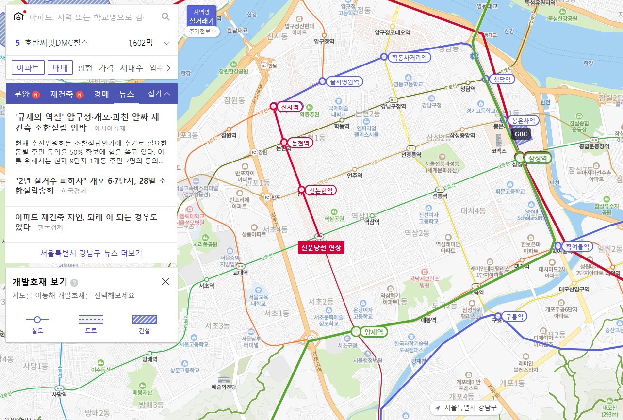 원하는 지역을 설정한 후 왼쪽 메뉴중에서 원하는 항목을 선택해서 볼 수 있는데. 위 지도에서 빨간색으로 표시되는 지역은 분양을 진행해서 아직 입주는 되지 않았거나, 분양 예정인 지역을 나타내는 곳이고 파란색 부분의 가격은 해당평수의 실거래가 가격이며, 하단의 흰색배경의 색상은 호가로 표현됩니다.